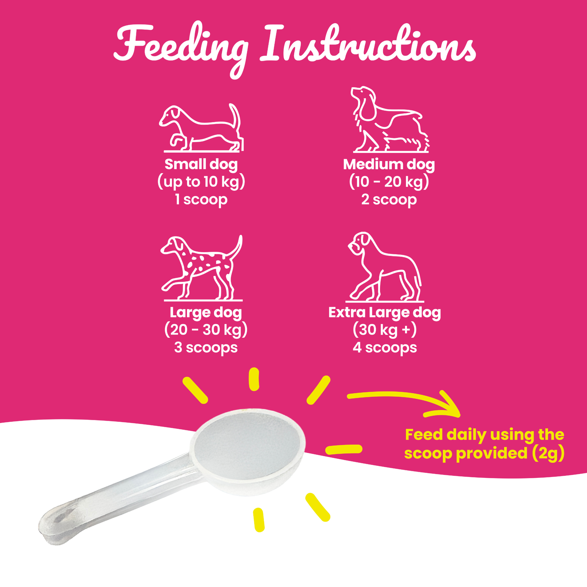 Feed daily using the scoop provided (2.5g).